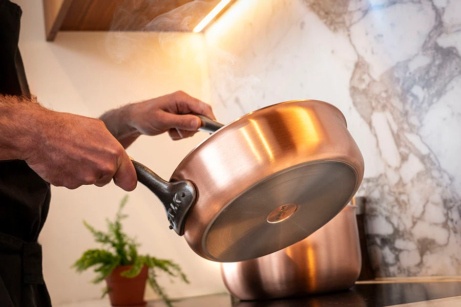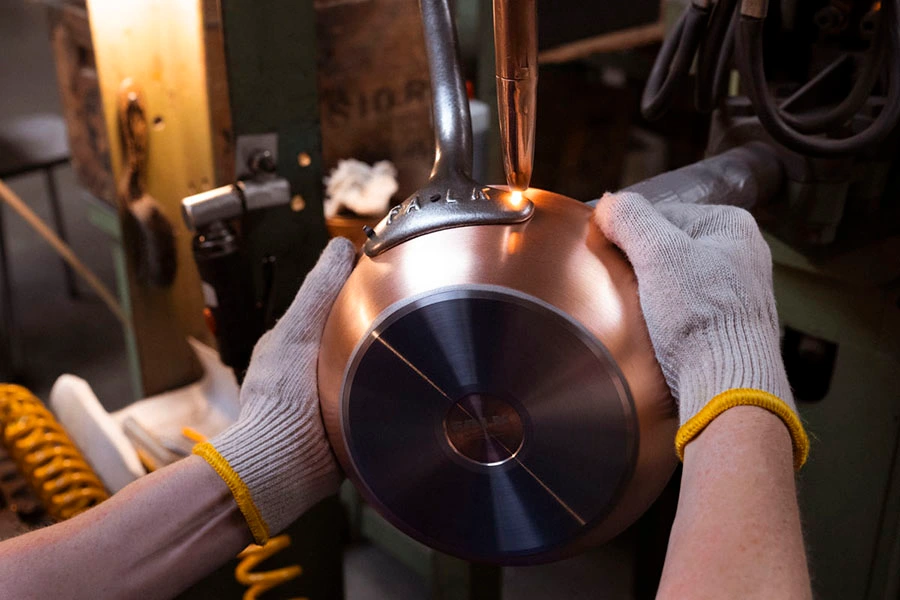 Fabrico Artesanal: Cada peça é cuidadosamente trabalhada à mão por artesãos experientes, incorporando a técnica bimetálica que combina cobre de alta condutividade com aço inoxidável durável, para desempenho otimizado e fácil manutenção.