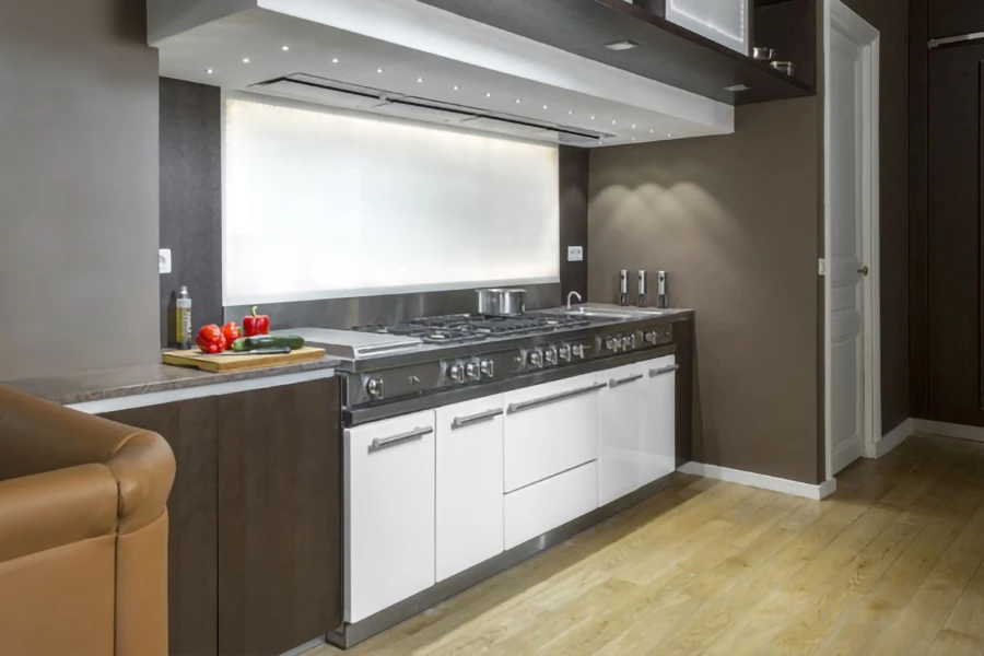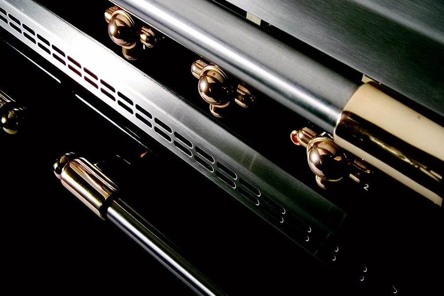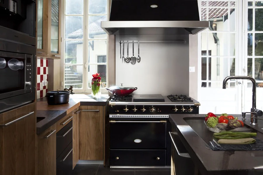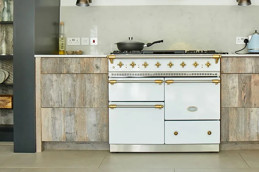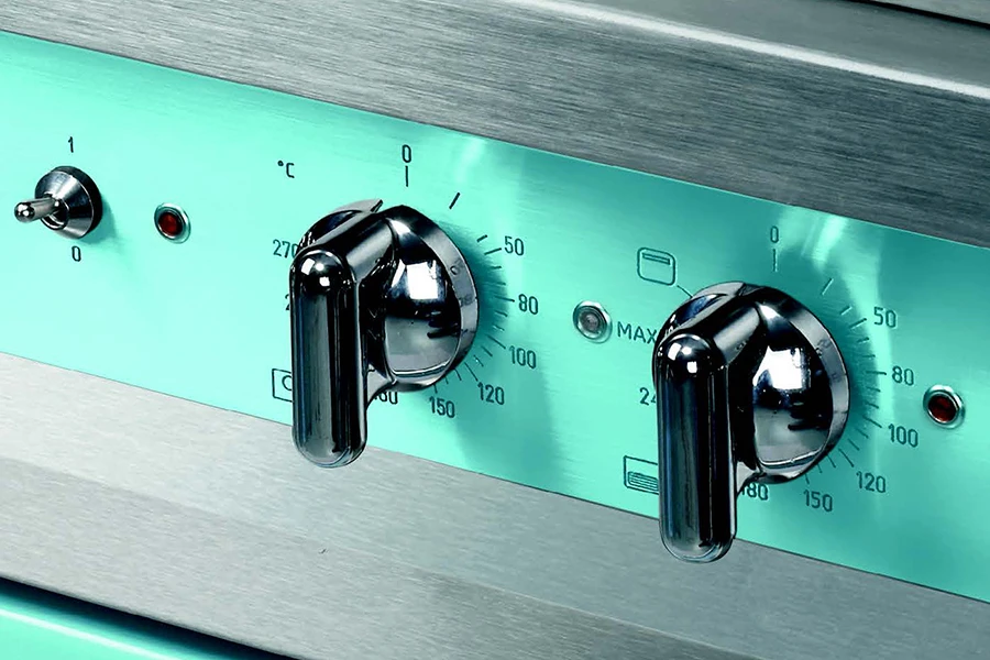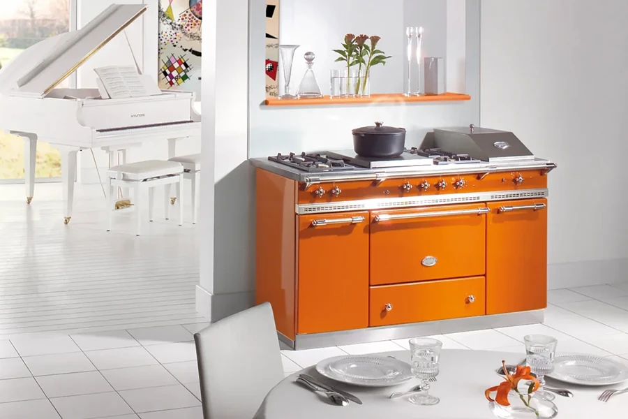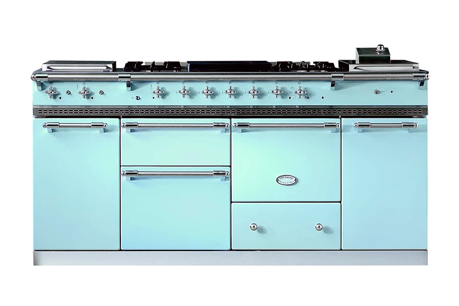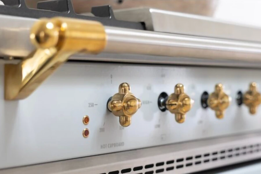 Configuração Sur Mesure: Total liberdade para configurar fornos (gás, elétrico estático e multifunções), queimadores, cores e acabamentos de manípulos.